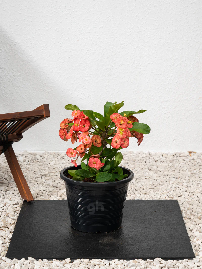 The Crown of Thorns plant typically grows to a height of 30cm to 40cm and has thick, fleshy leaves that are arranged in pairs along the stem. The leaves are oval-shaped and have a glossy texture, with a dark green color that contrasts beautifully with the bright red, pink, or yellow flowers that bloom on the plant.